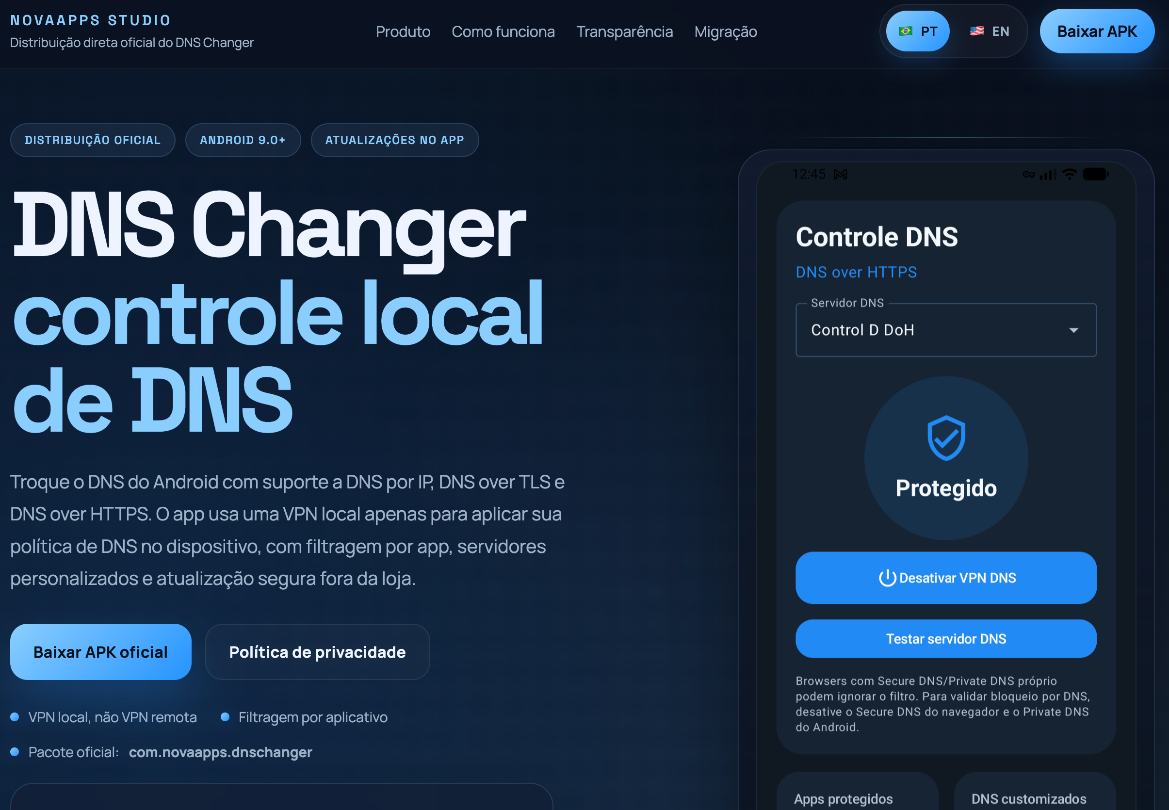 Aplicativo Android para controle local de DNS (Android 9.0+). Utiliza uma VPN local para aplicar políticas de DNS sem rotear o tráfego através de um servidor remoto. Suporta DNS por IP, DNS over TLS (DoT) e DNS over HTTPS (DoH), filtragem por aplicativo, e oferece distribuição oficial de APK com atualizações seguras. Foco total em privacidade com processamento local.